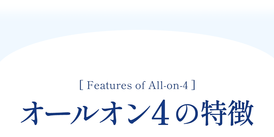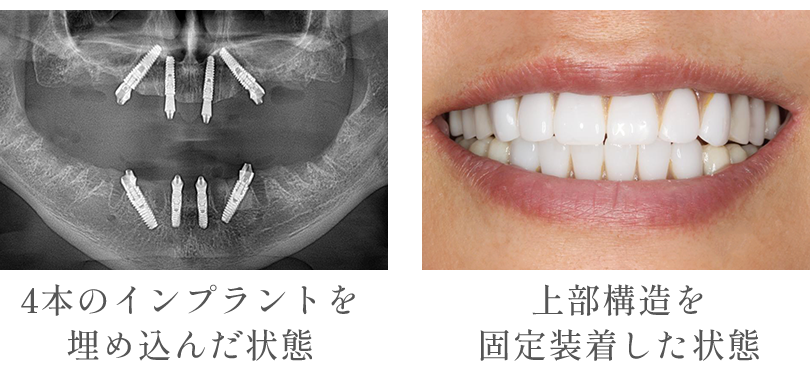 A 4本のインプラントで歯列全体を支え、手術当日中に仮歯が装着される治療法です。従来のインプラント治療よりインプラント数を減らし、骨移植を回避できることができます。治療期間が従来の一般的なインプラント治療よりはるかに短く安定した治療経過を得られるのが特徴です。