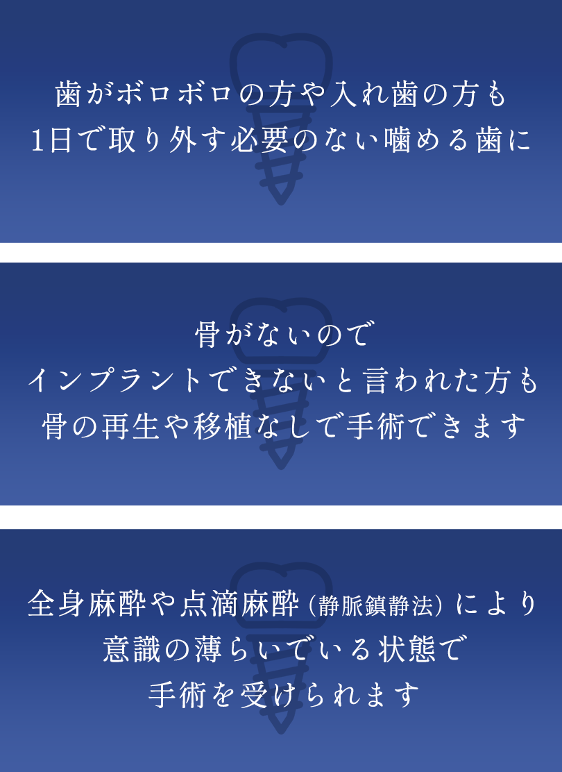 「1日でその日の夜には食事ができる」そんな魔法のような治療があります。いま歯がボロボロの人、歯がグラグラの人でもOK。総入れ歯の人もOK。