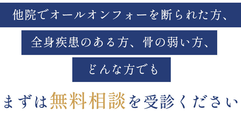 よくあるのが「骨がないからインプラントができないと他院で言われた」という相談です。当院ではザイゴマ(頬骨)インプラントや、テリゴイド(蝶形骨翼状突起)インプラントを実施することができることで、どのような骨の状況でも、インプラント治療が可能となっています。
